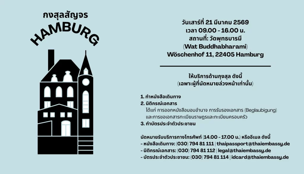 Der Mobile Konsular-Service der Königlich Thailändischen Botschaft kommt am 21. März 2026 wieder nach Hamburg.